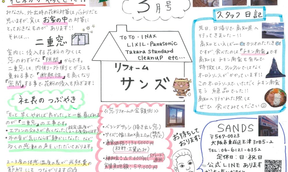 大阪市で活動しているリフォームサンズです!! ショールームの前に施工事例の写真のパネルを展示しております。 水回り以外の工事も承っておりますので、お気軽にお問い合わせくださいませ。   […]